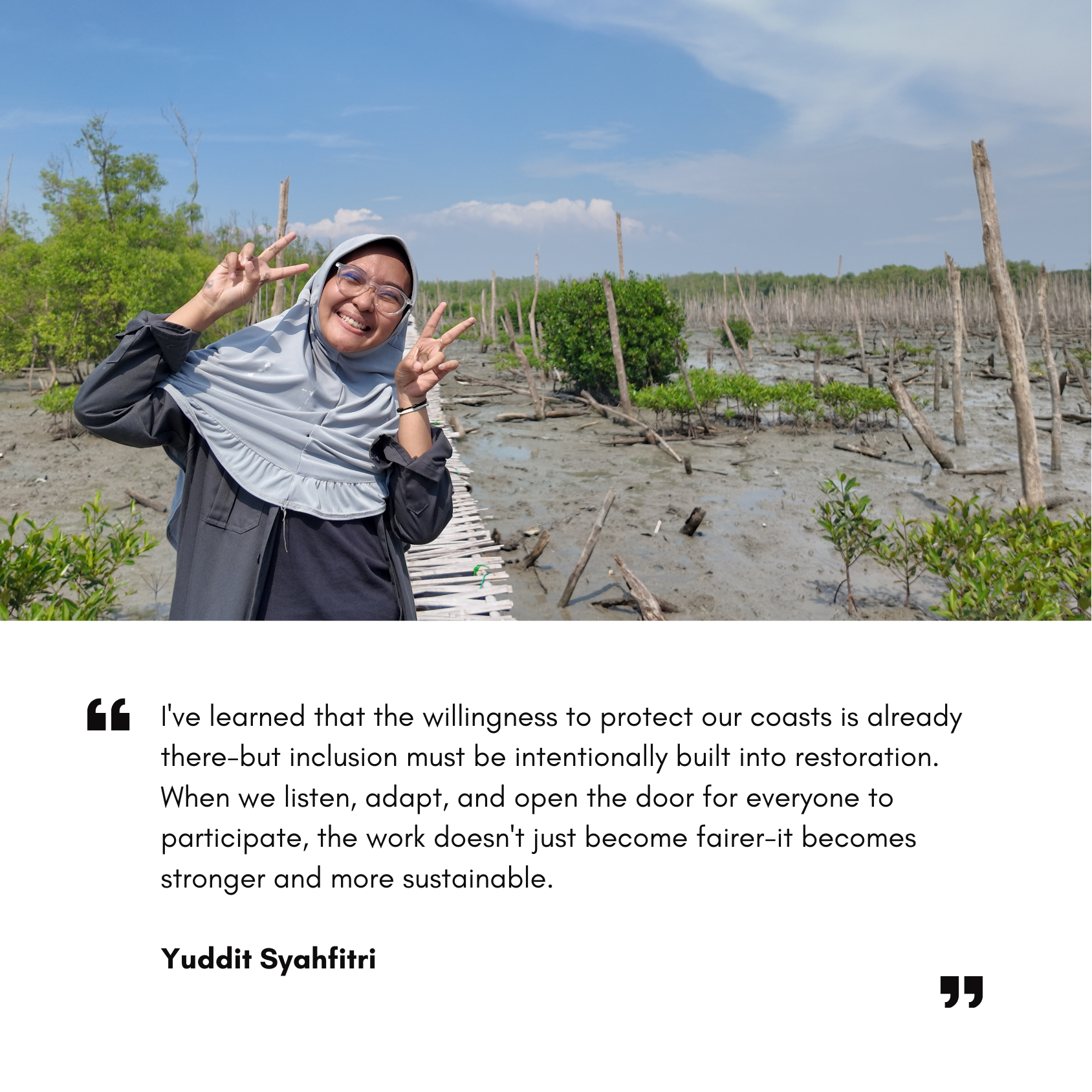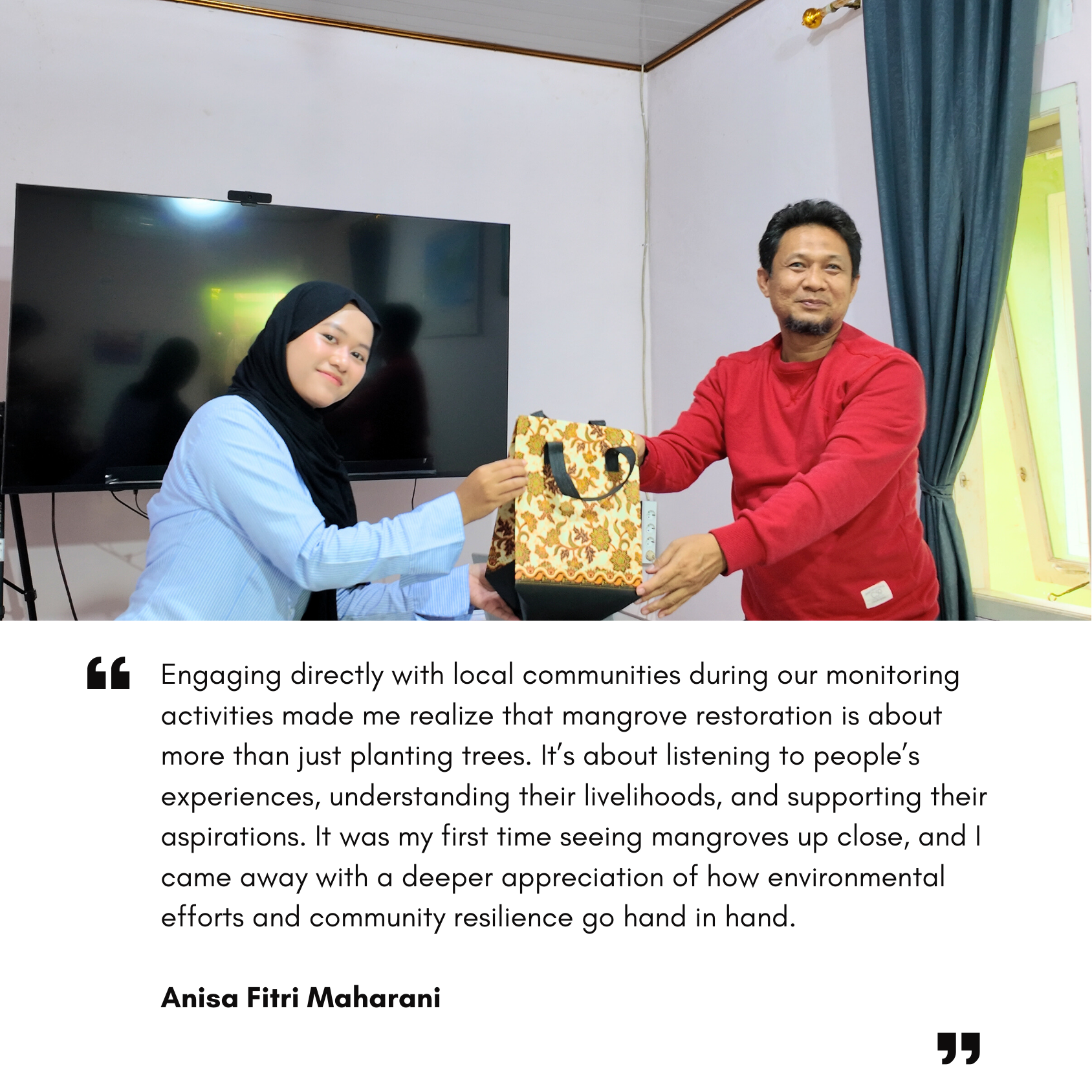 Anisa Fitri Maharani joined the socio-economic monitoring team, engaging directly with residents in Purworejo Village. Through interviews and focus group discussions, her team assessed how restoration was affecting local livelihoods and perceptions.