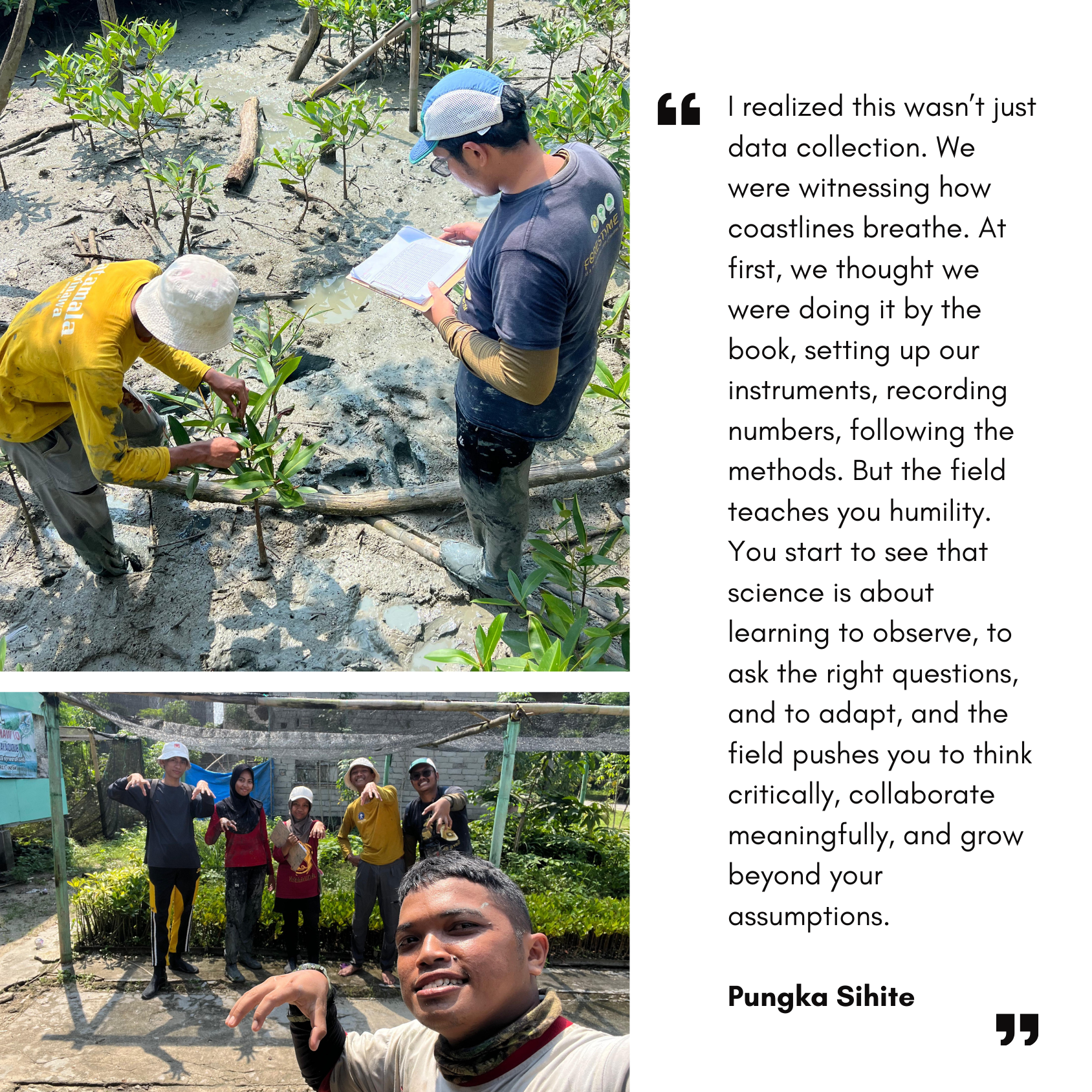 Pungka Sihite was assigned to monitor the oceanographic aspects of the mangrove restoration site, but what he discovered went far beyond tidal charts and water levels. He was tasked to calculate mangrove density across three observation stations representing sparse, moderate, and dense growth. What began as a standard data collection assignment quickly evolved into a hands-on lesson in ecological complexity, field improvisation, and collaboration.