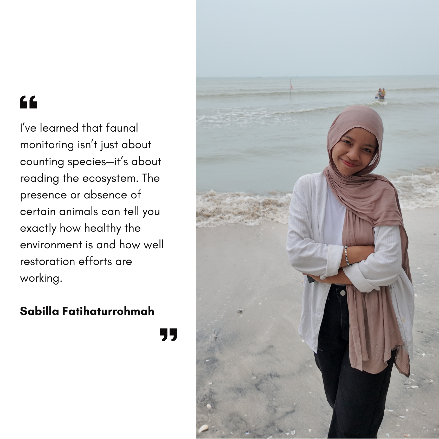 Sabilla Fatihaturrohmah took on the role of fauna monitoring assistant—tracking signs of life above and below the water. Sabilla’s work involved sampling macrozoobenthos, insects, birds, and nekton, each of which offers insight into the health of the mangrove ecosystem.