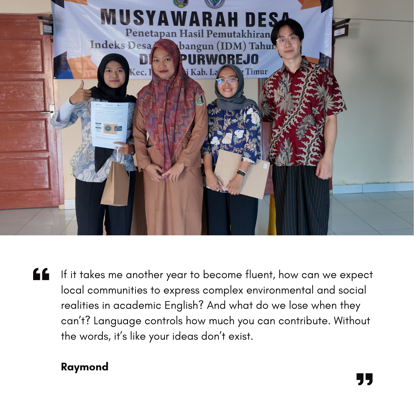 Assigned to support socio-economic interviews in Purworejo Village, East Lampung, Raymond expected to lean on his past fieldwork experience in rural Uganda. But soon he found that conversational Bahasa Indonesia wasn’t enough. In the fast-paced, nuanced world of field interviews and stakeholder dialogues, words slipped past him. He could catch 80% of the conversation, but the most critical 20% such as the nuance and the core meanings, remained out of reach.